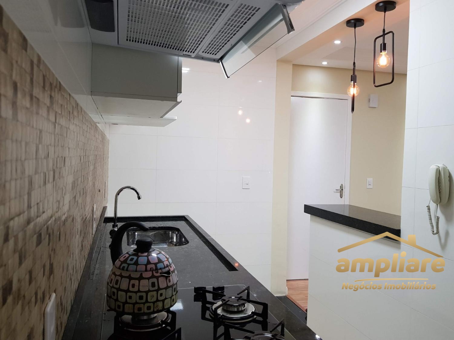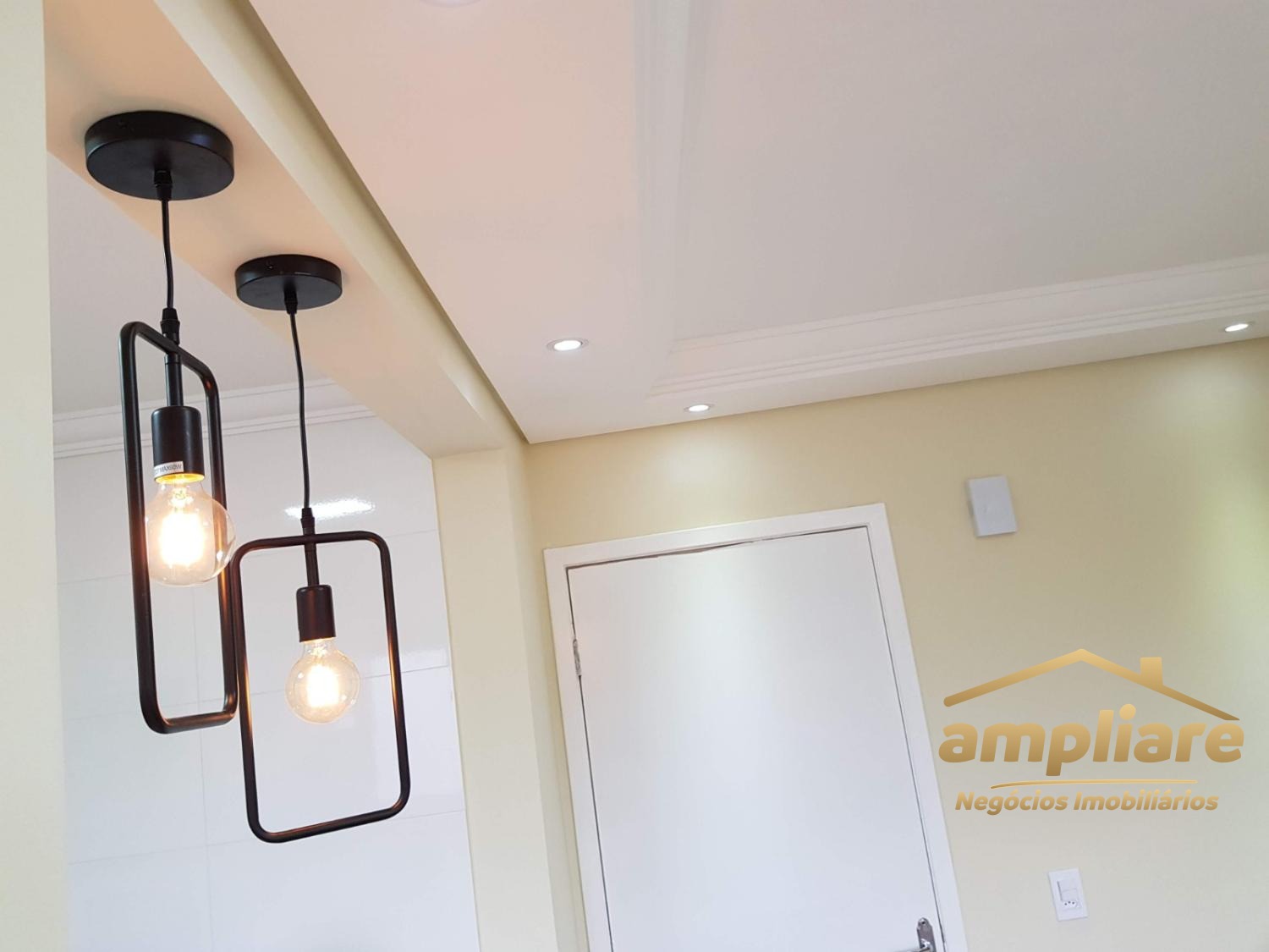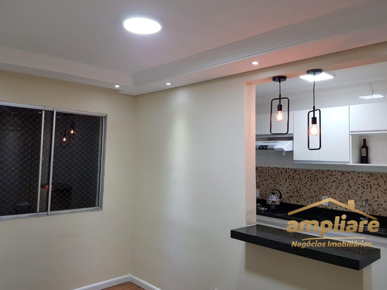 Ambientes Planejados : Cozinha com armários, cooktop e exaustor. Banheiro moderno com pia em mármore, cuba de sobrepor e box de vidro, sala e corredor com sanca de gesso e LED; balcão com pendentes decorativos.