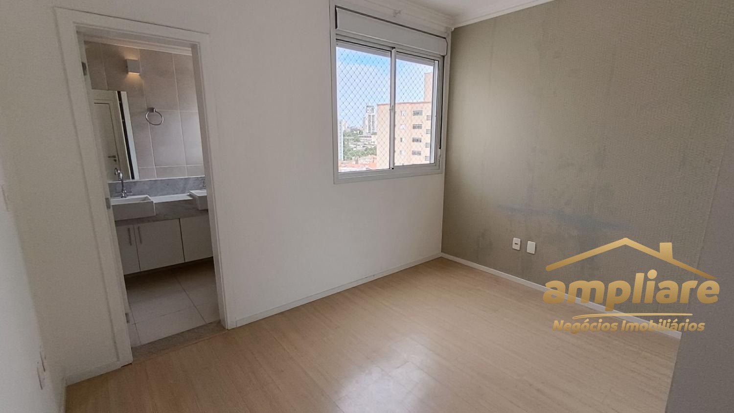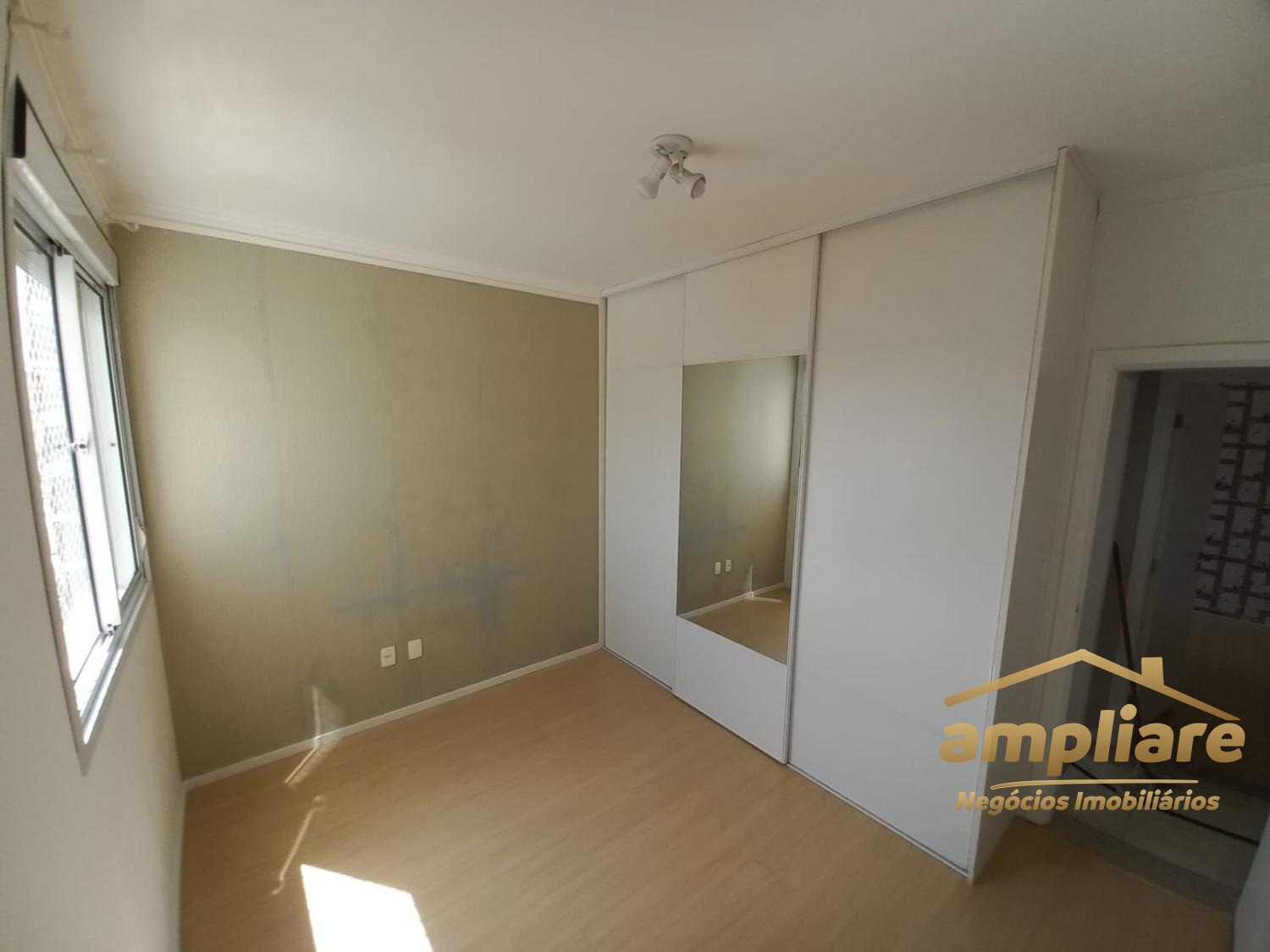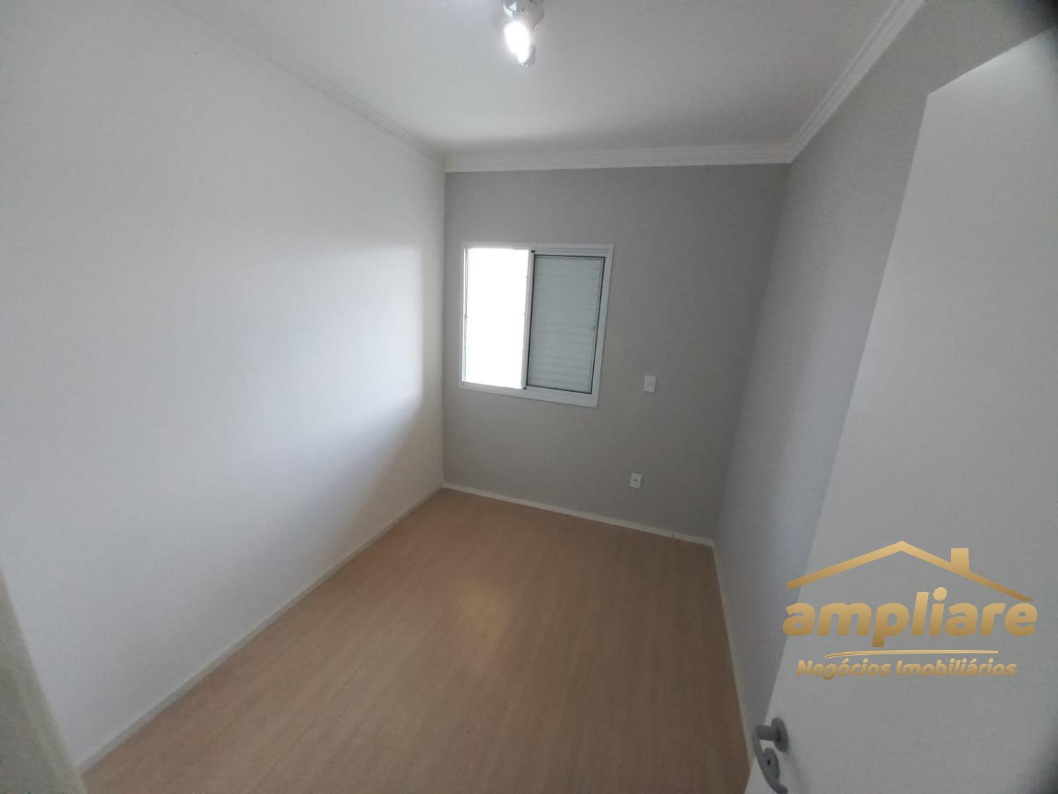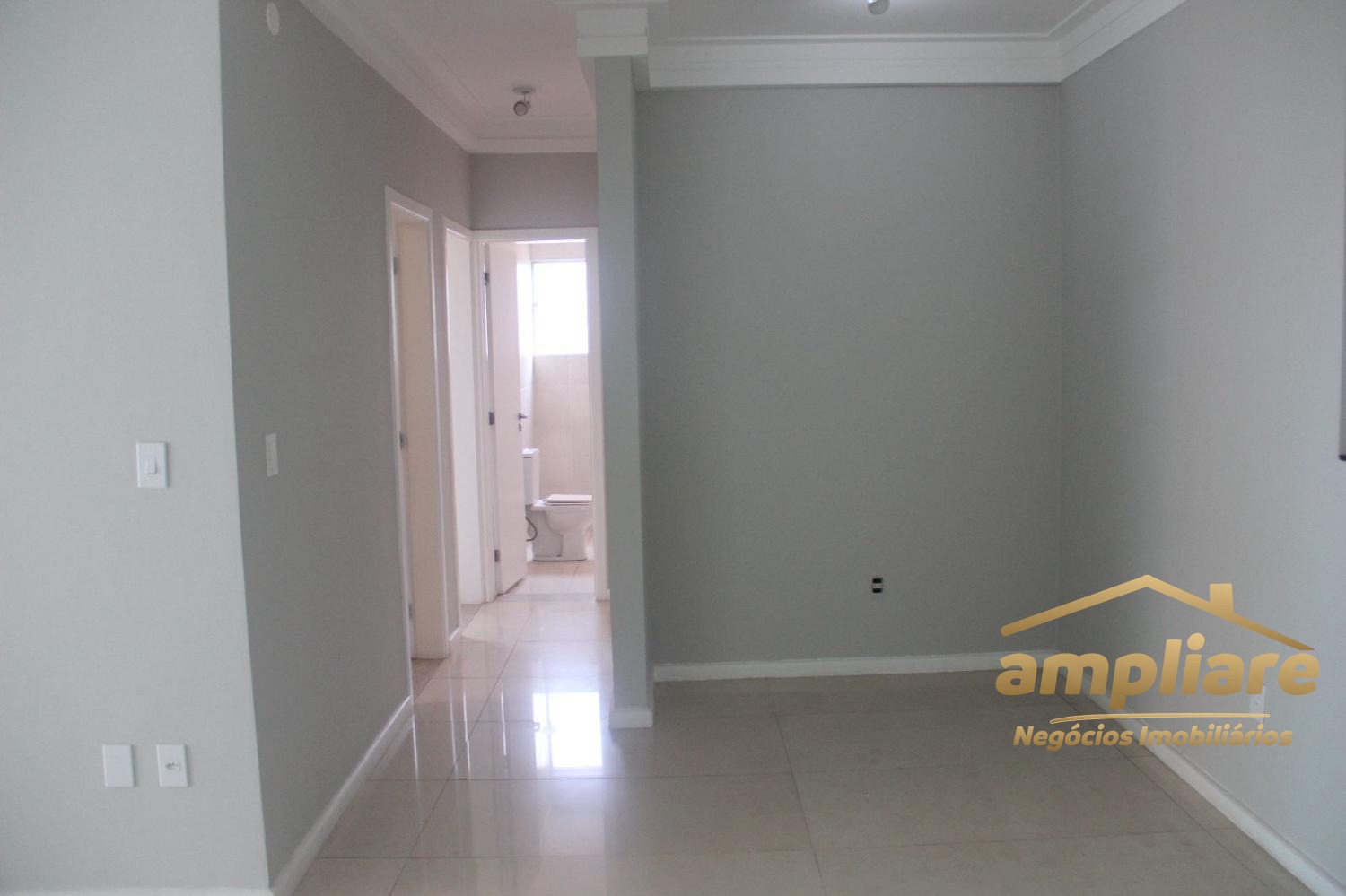 Os acabamentos incluem porcelanato na sala e áreas molhadas, e piso laminado nos dormitórios.