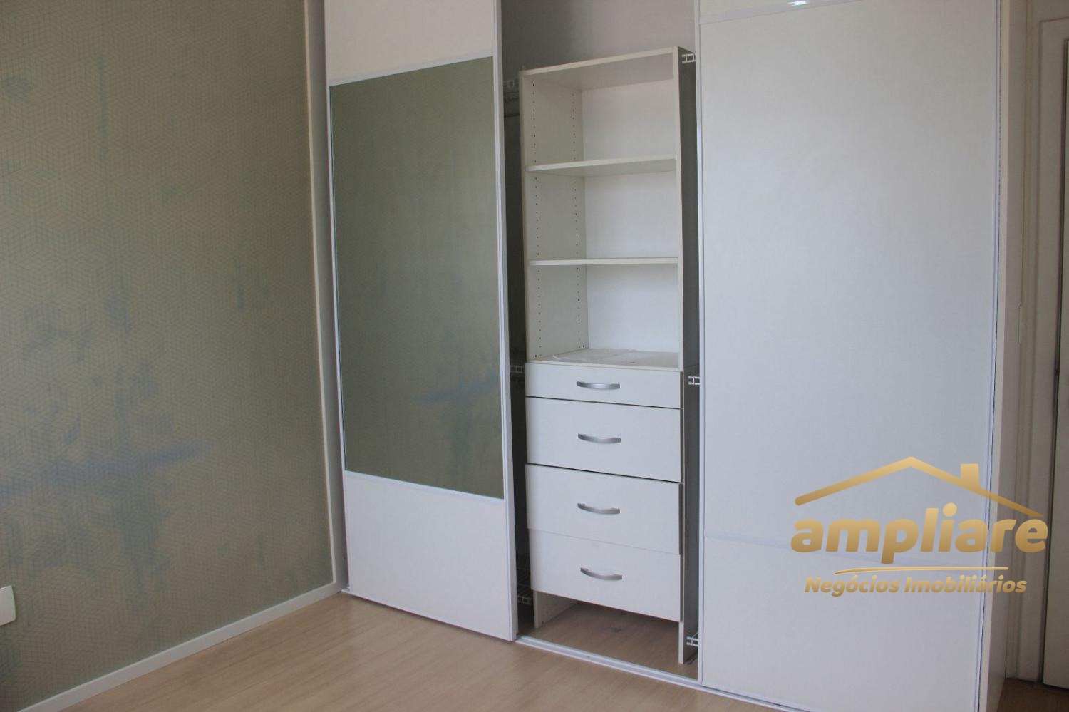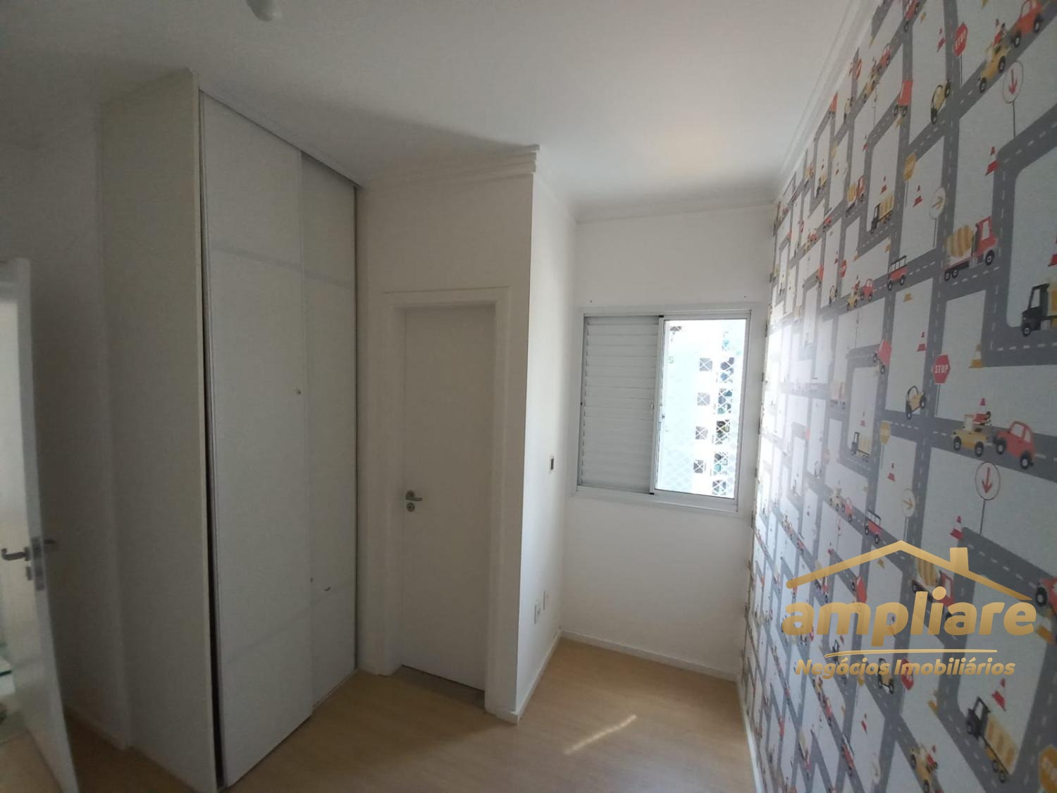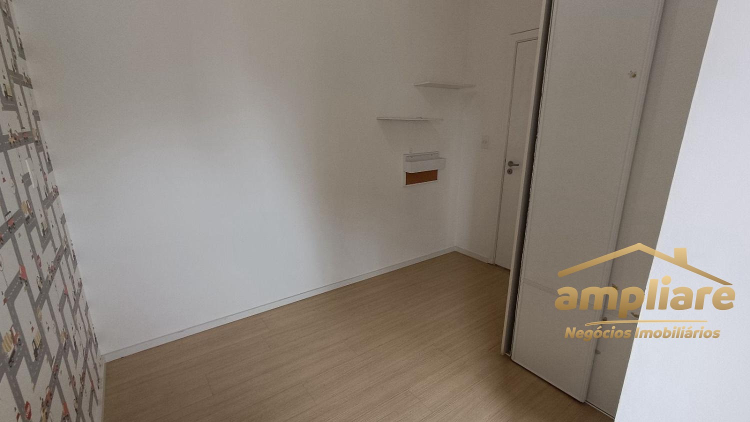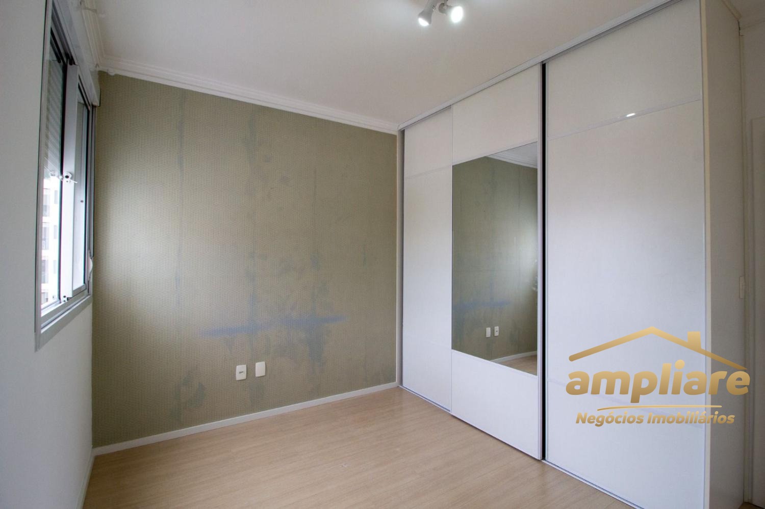 Os acabamentos incluem porcelanato na sala e áreas molhadas, e piso laminado nos dormitórios.