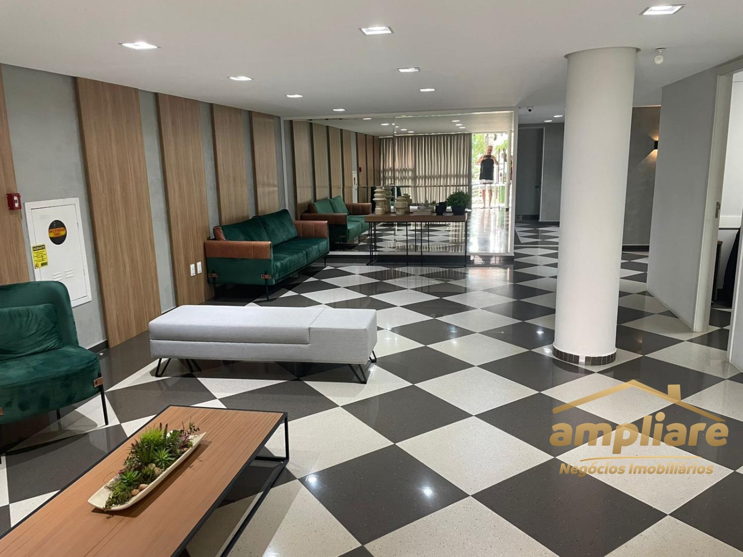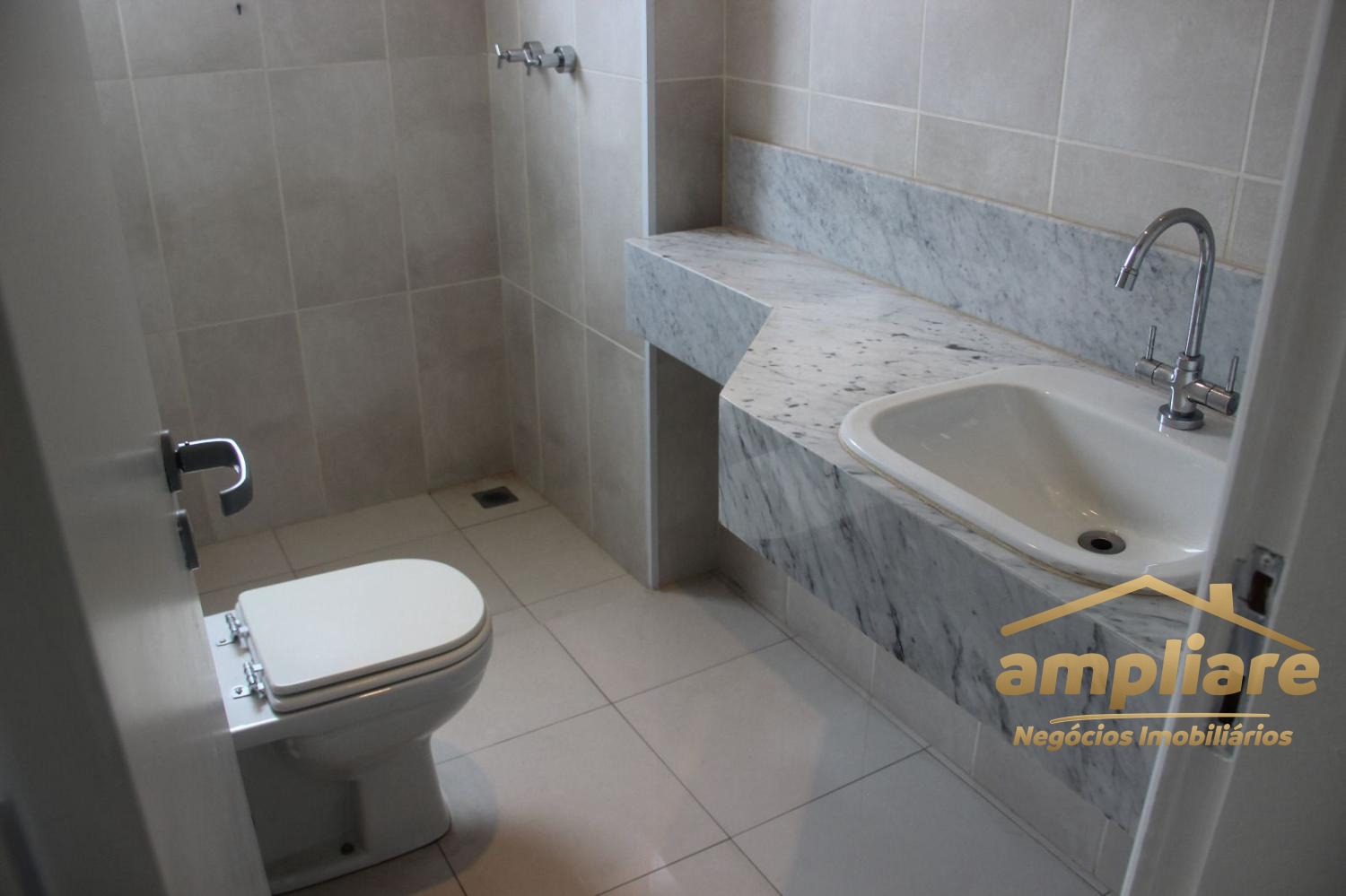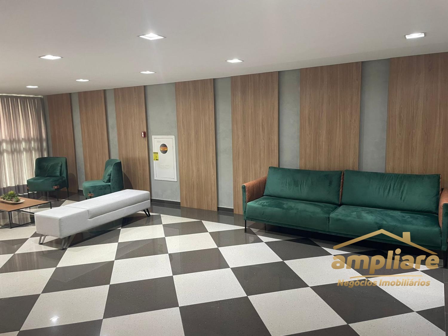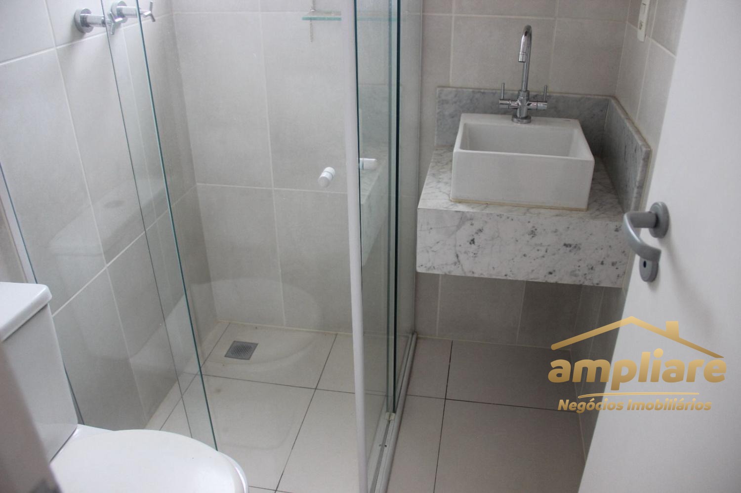 Os acabamentos incluem porcelanato na sala e áreas molhadas, e piso laminado nos dormitórios.