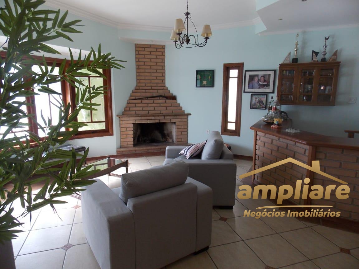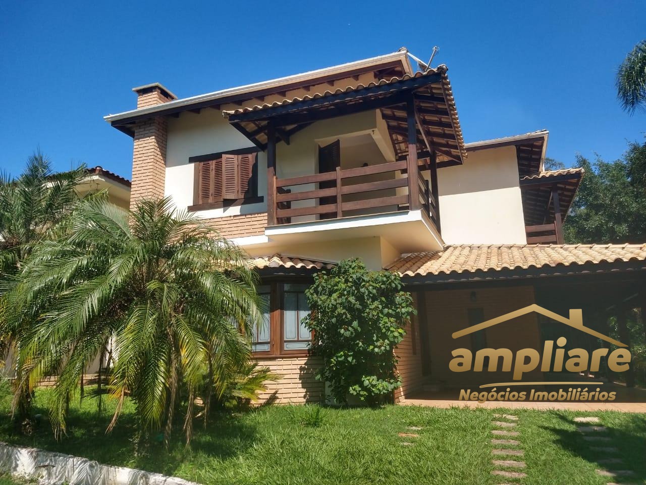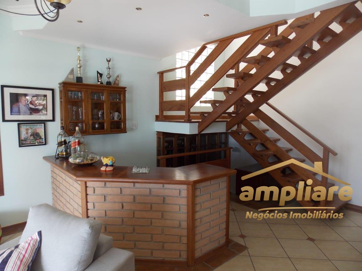 No pavimento superior, o imóvel conta com 5 dormitórios, sendo 3 suítes, todos com acesso à sacada, proporcionando excelente iluminação natural e ventilação. No pavimento térreo, possui sala de estar com lareira, adega sob a escada, sala de TV fechada e cozinha com copa integrada, com acesso direto à área de churrasqueira, que conta com banheiro de apoio e forno de pizza.