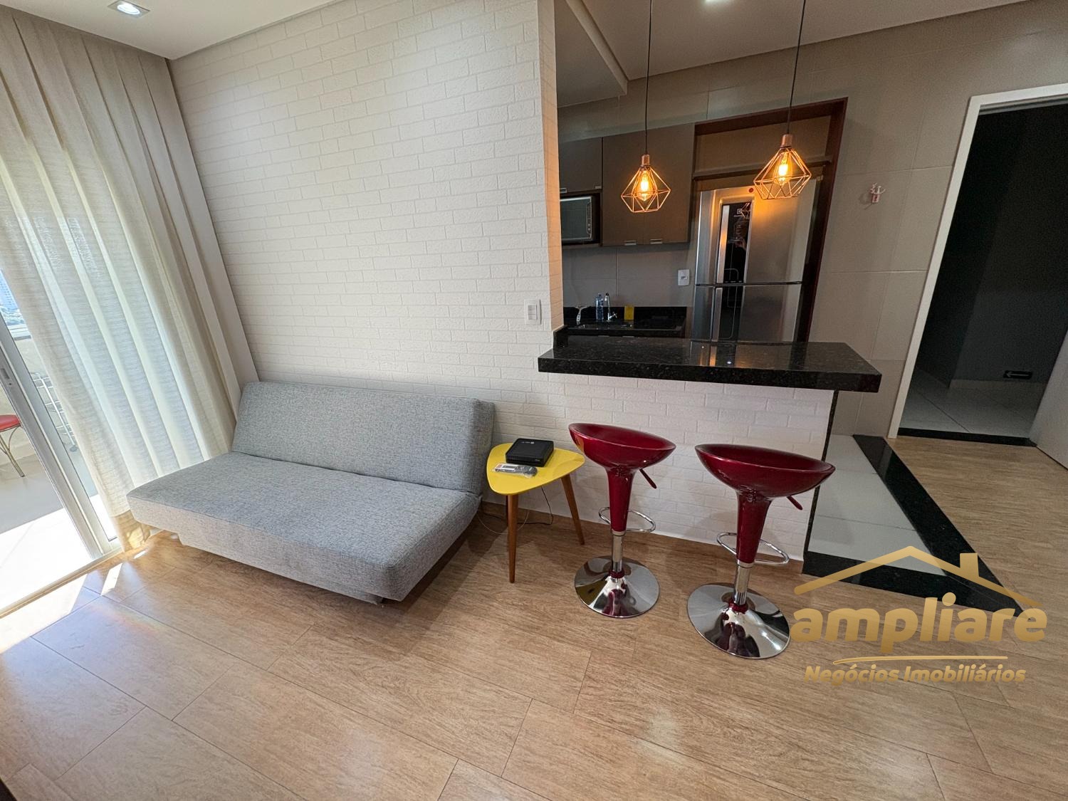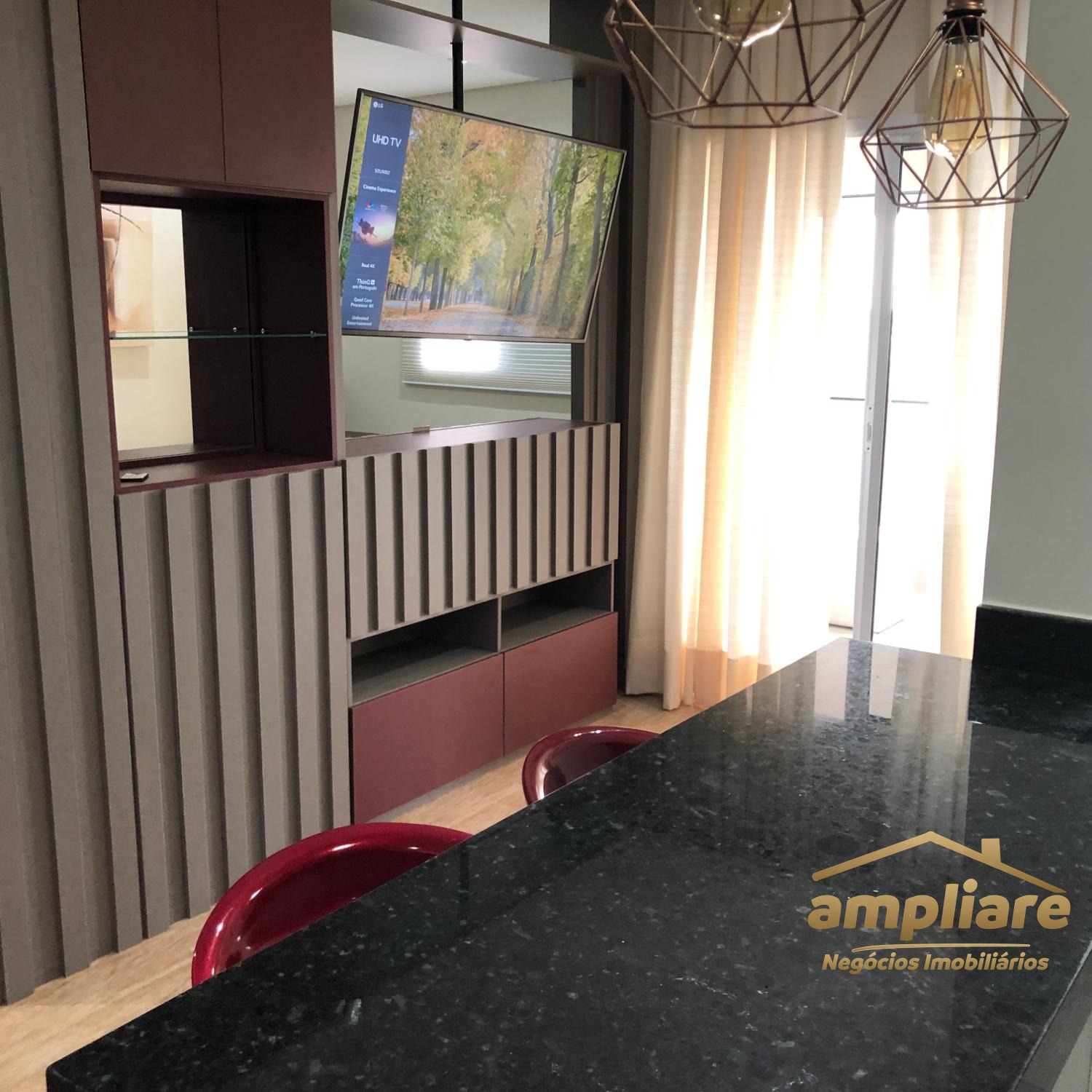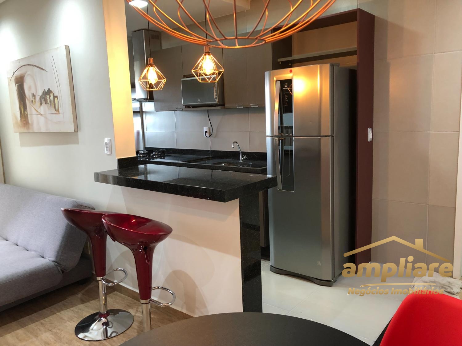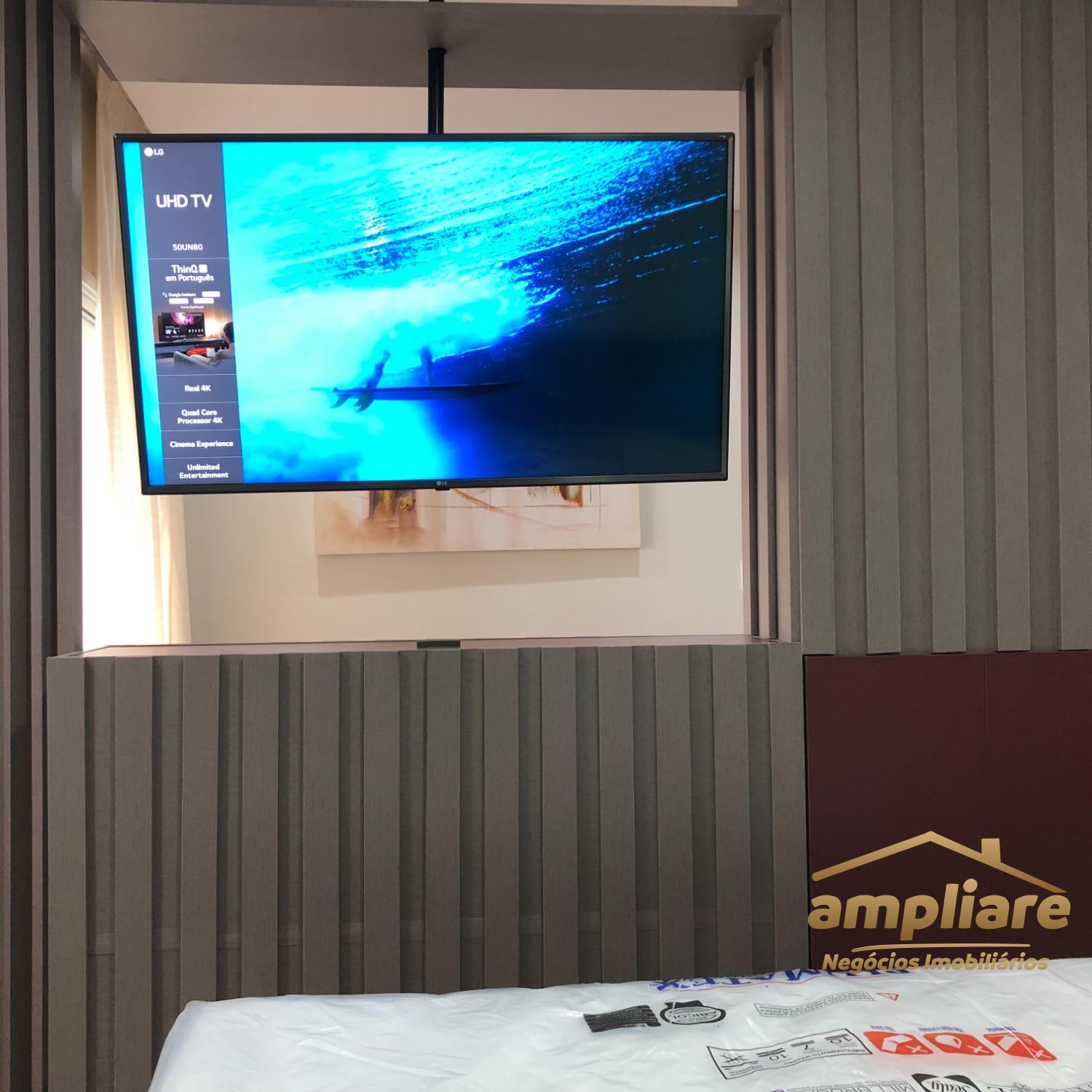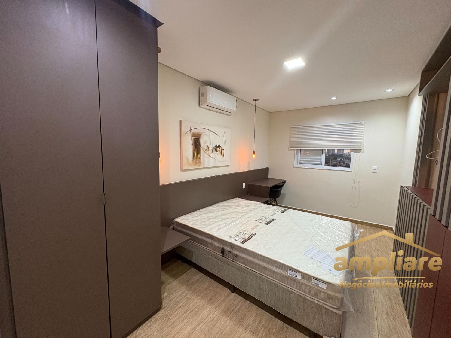 A cozinha é completa, com cooktop, forno elétrico, coifa, micro-ondas e geladeira duplex, além de armários planejados e bancada para trabalho. O imóvel conta com acabamentos de alto padrão, como teto em gesso, iluminação planejada e cortinas sob medida.