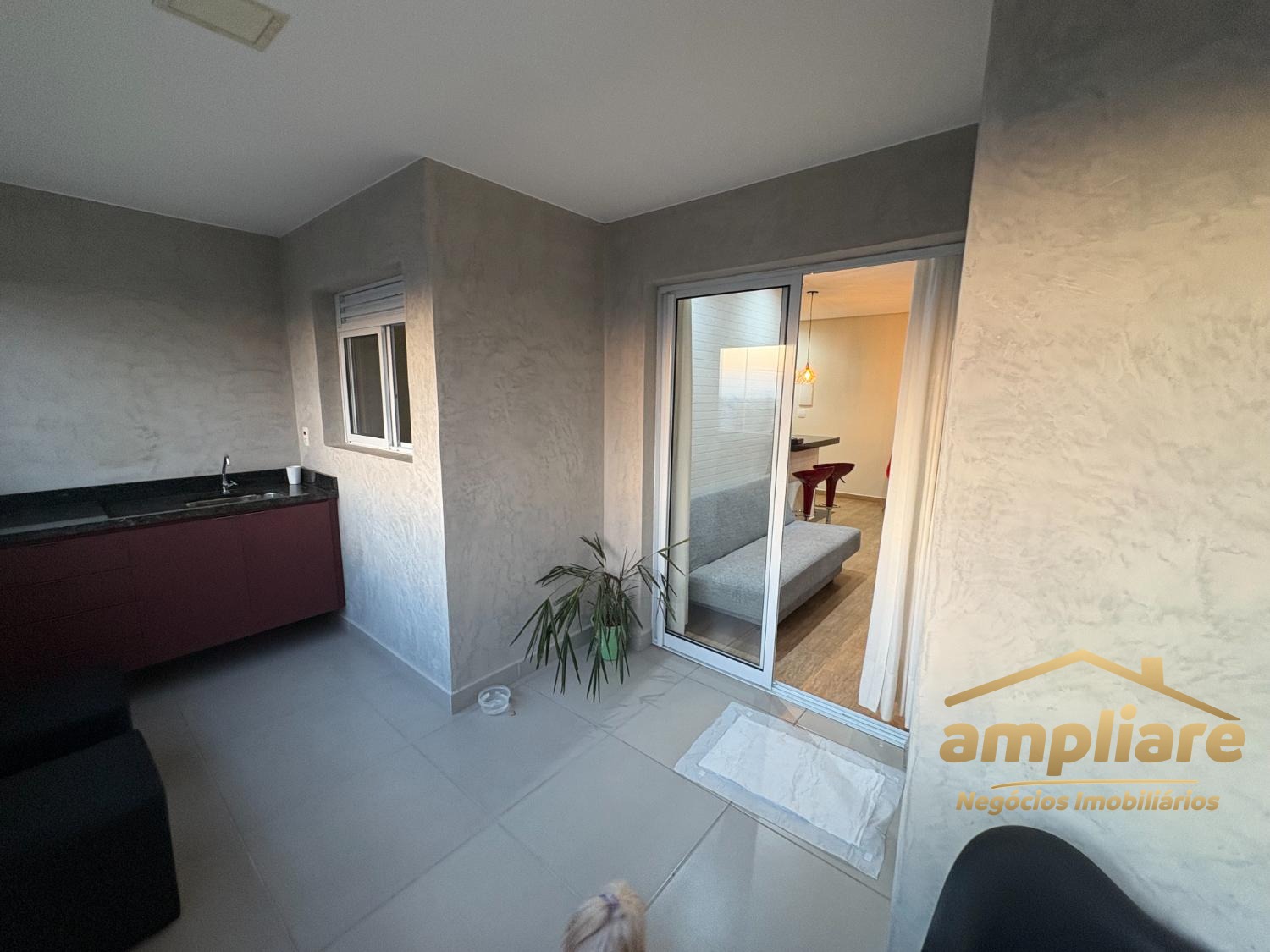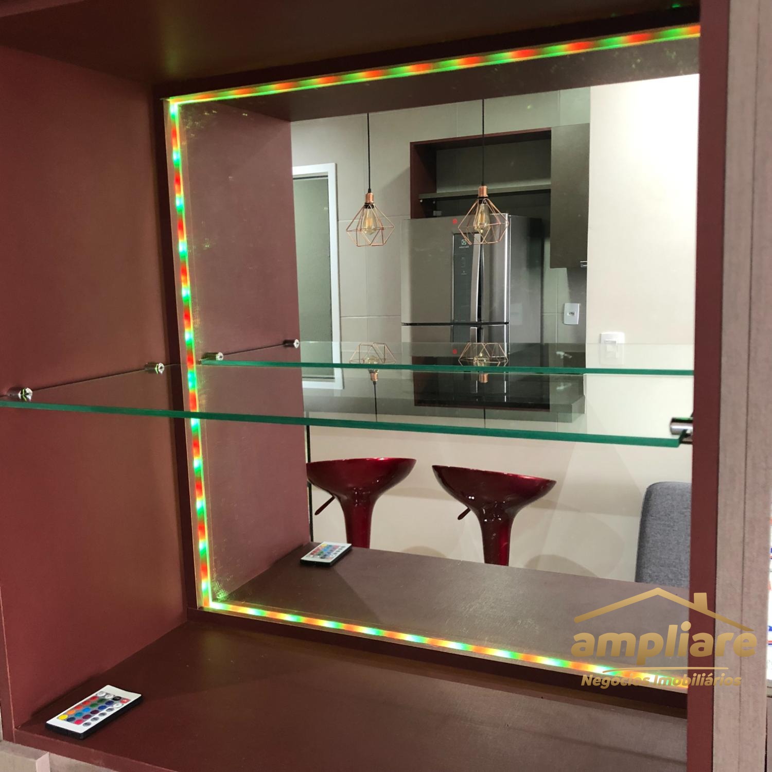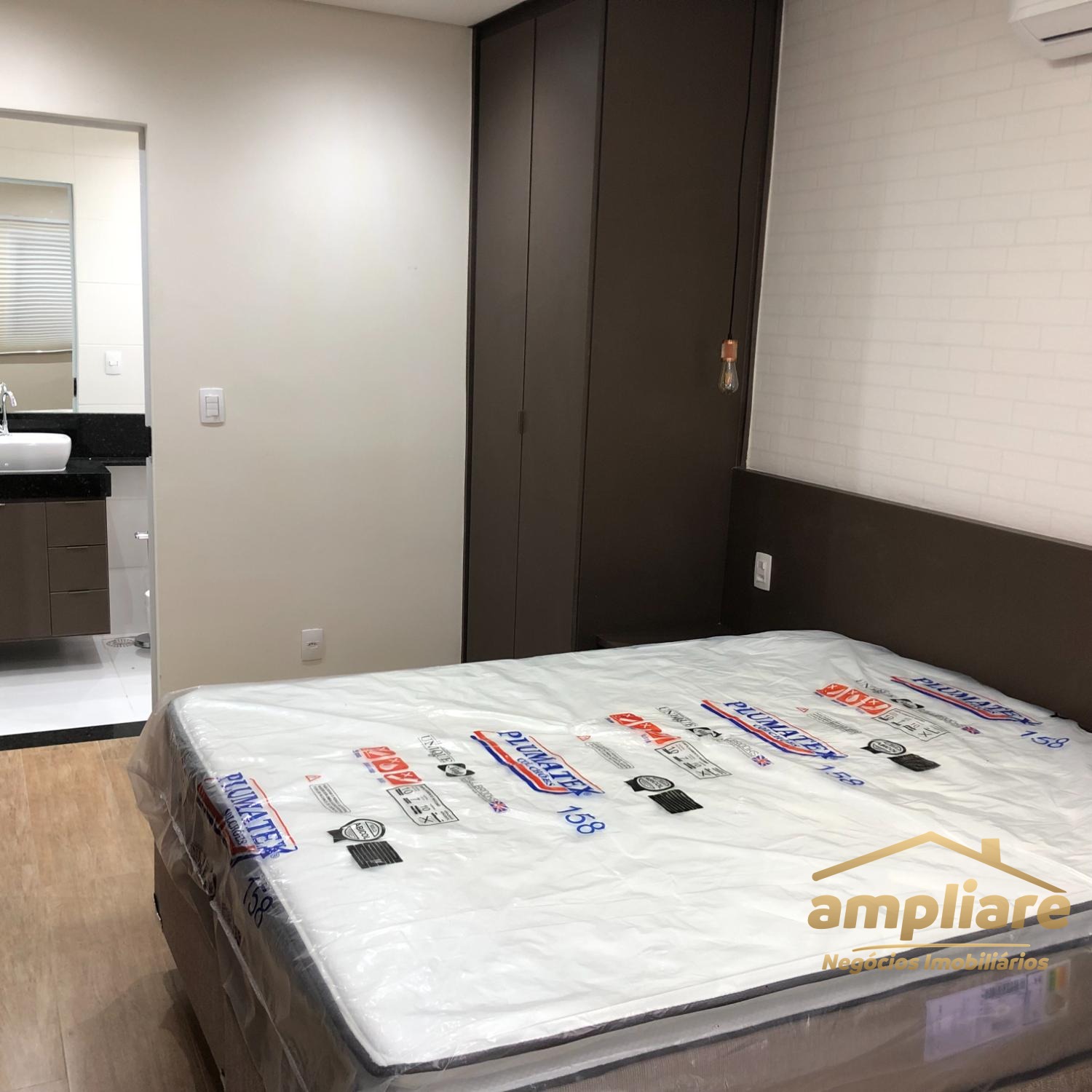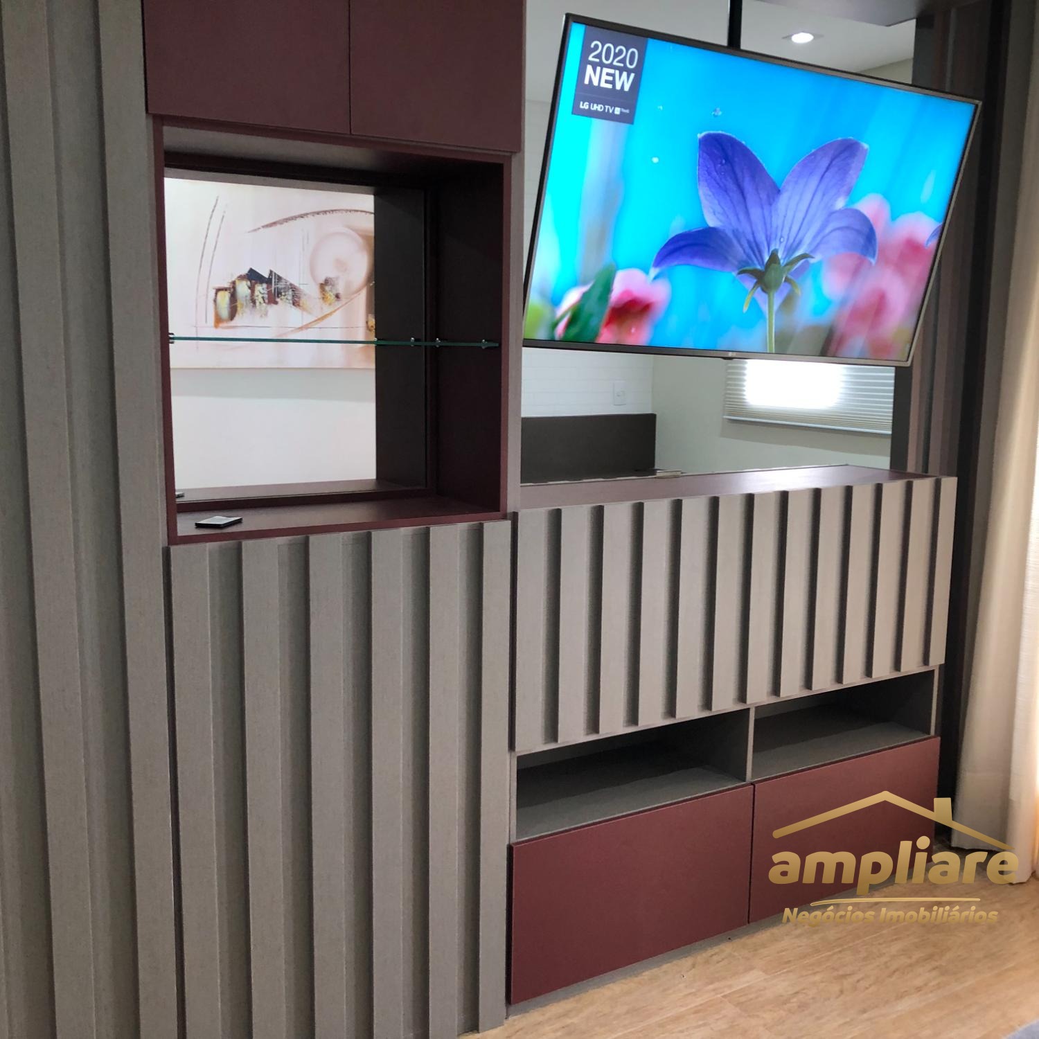 A cozinha é completa, com cooktop, forno elétrico, coifa, micro-ondas e geladeira duplex, além de armários planejados e bancada para trabalho. O imóvel conta com acabamentos de alto padrão, como teto em gesso, iluminação planejada e cortinas sob medida.