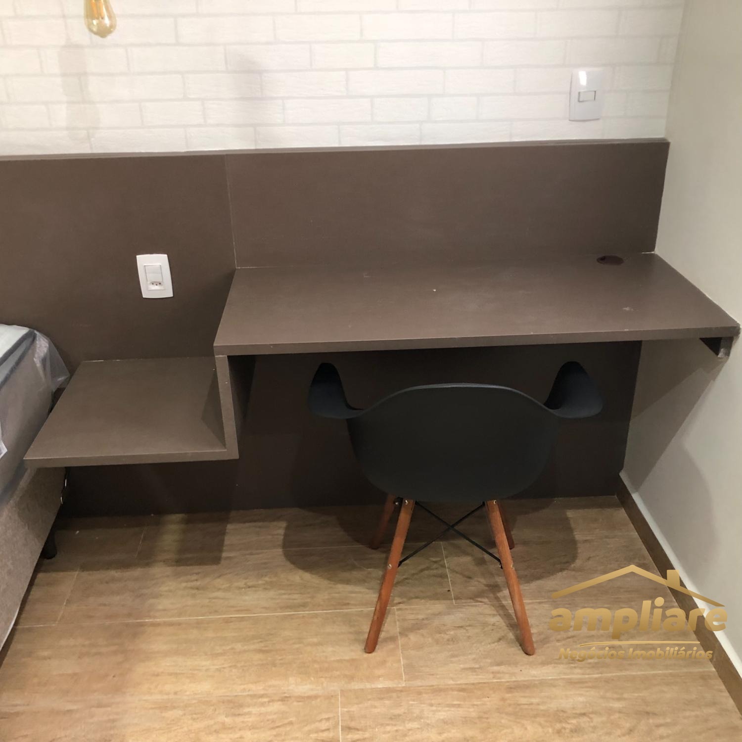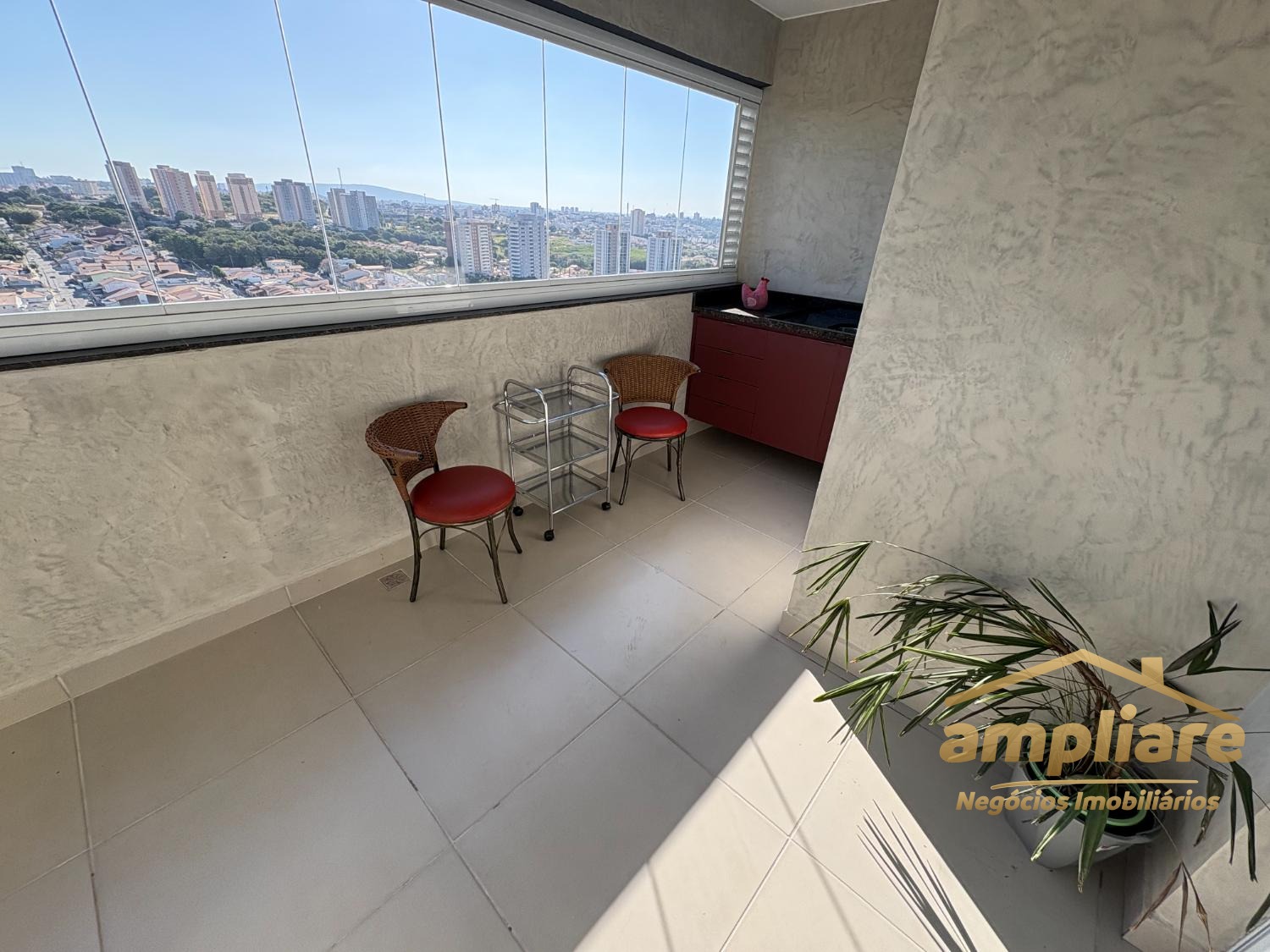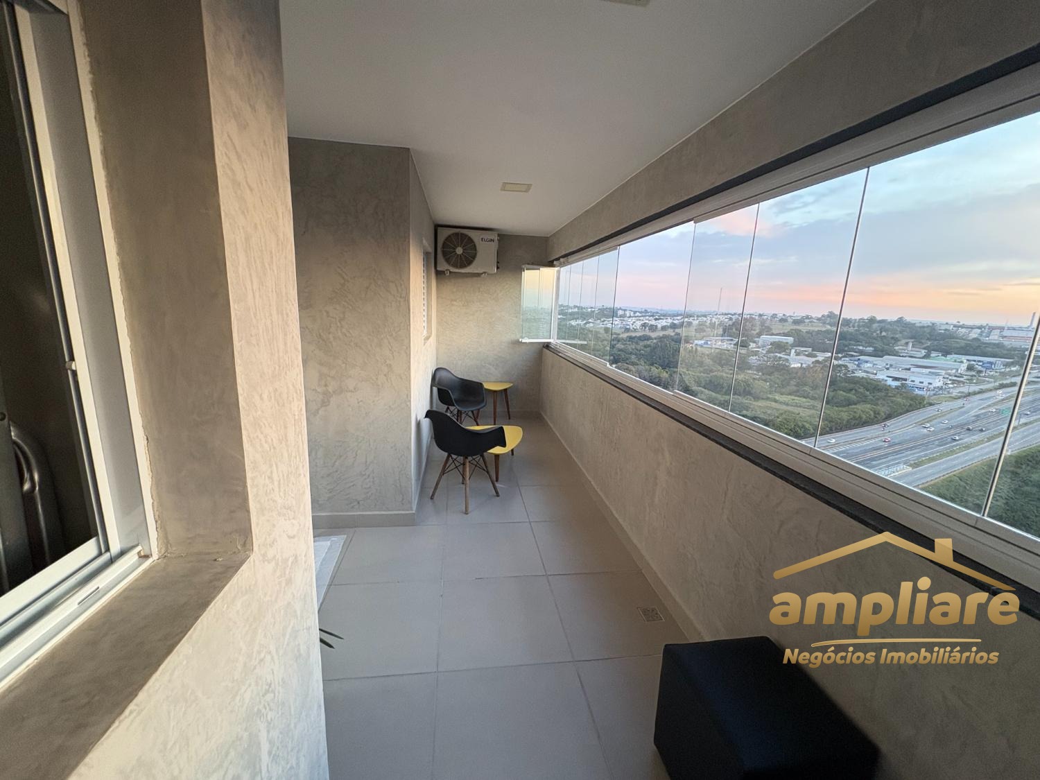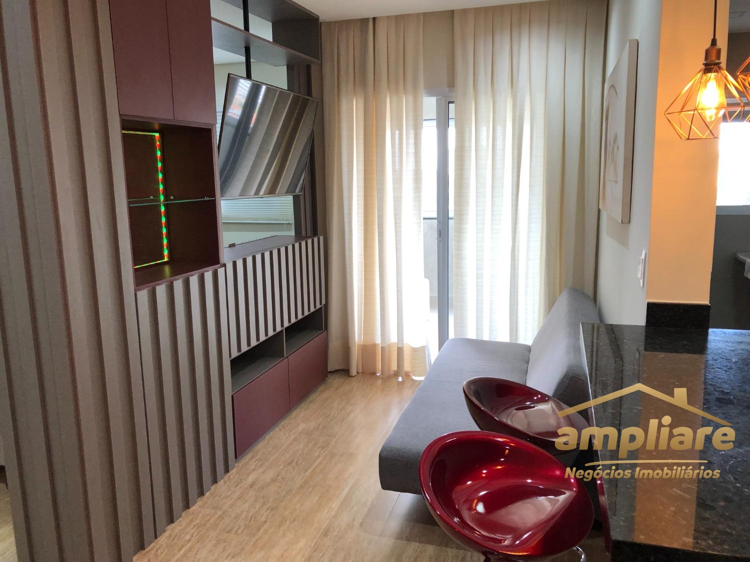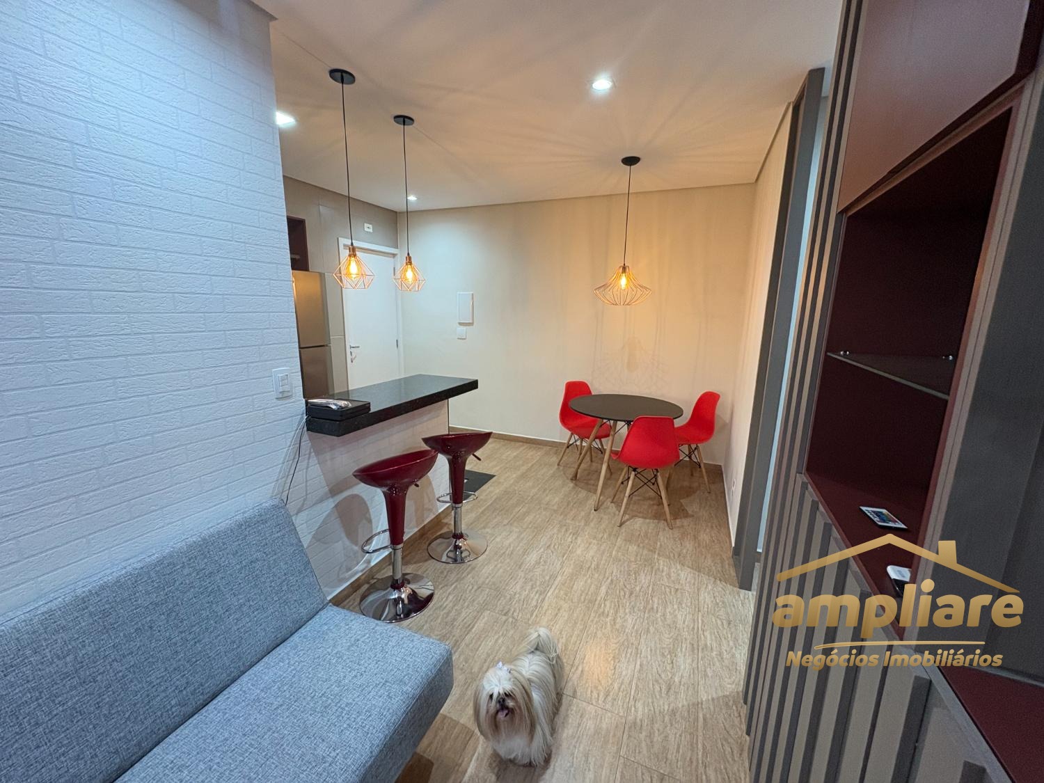 A cozinha é completa, com cooktop, forno elétrico, coifa, micro-ondas e geladeira duplex, além de armários planejados e bancada para trabalho. O imóvel conta com acabamentos de alto padrão, como teto em gesso, iluminação planejada e cortinas sob medida.