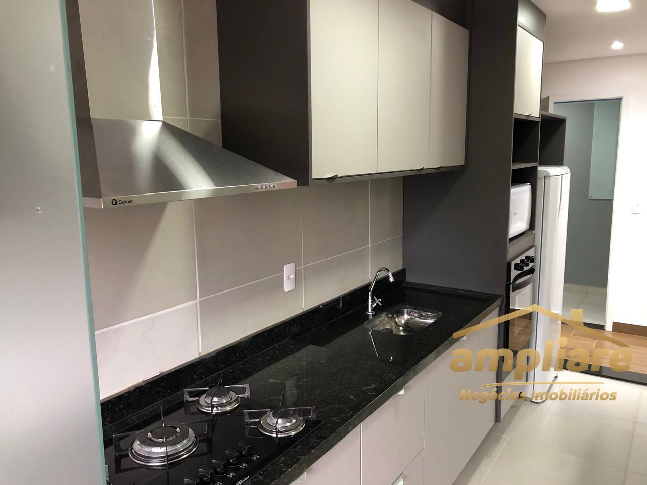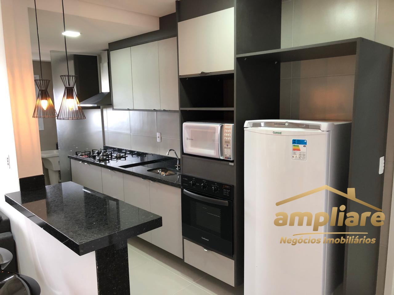 O imóvel conta com 1 suíte, 1 vaga de garagem coberta e ambientes planejados com armários Criare em todos os cômodos. A cozinha é completa, equipada com cooktop, forno elétrico, coifa, micro-ondas e geladeira.